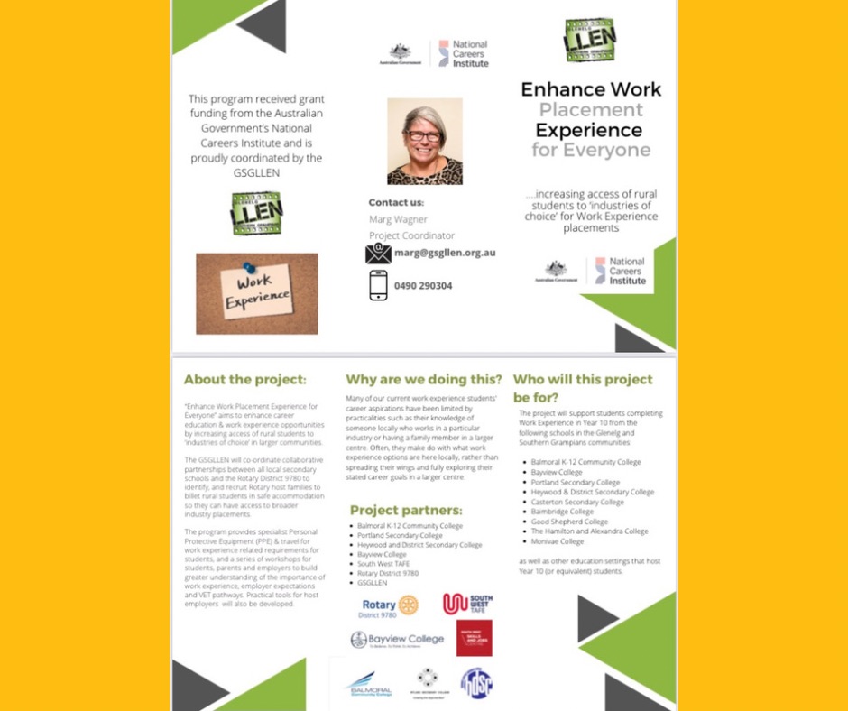 Rotary District 9780 and in particular the District Youth Committee have partnered with the Glenelg and Southern Grampians Local Learning and Employment Network (GSGLLEN) on a project named “Enhance Work Placement Experience for Everyone” (AKA Enhance Work Experience or EWE). The project is funded by the National Careers Institute.
